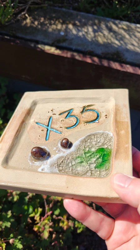 House number in the sand with rock pool; Beige clay