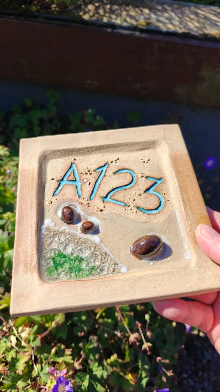 Eircode in beige clay. Uses two tiles